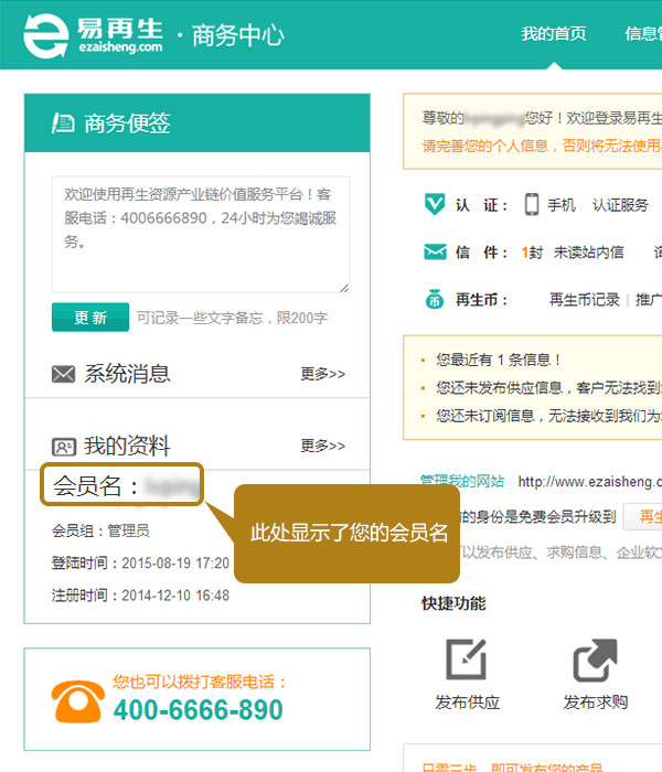 请使用手机号或邮箱直接登录,登录后可在商务中心中查看会员名。如图所示: